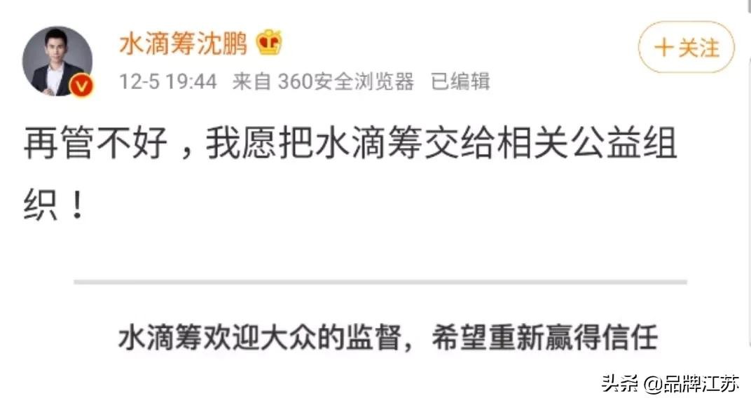 12月5日晚,水滴筹创始人沈鹏发布了近3000字的公开声明,称“错了就是错了”“再管不好,我愿把水滴筹交给相关公益组织”。