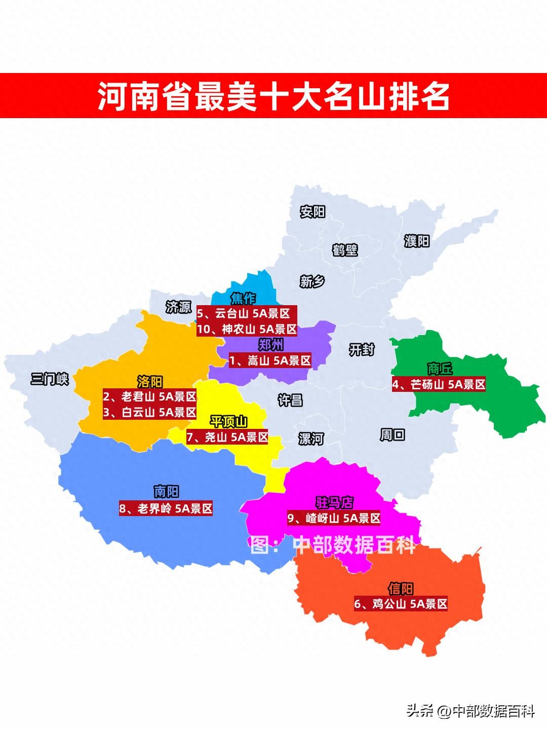 河南最美十大名山,河南省最著名的十大名山排名,嵩山、老君山、白云山排名前三,嵖岈山、神农山都上榜!河南十大名山全部为5A景区,不愧是全国山景资源最丰富的省份。