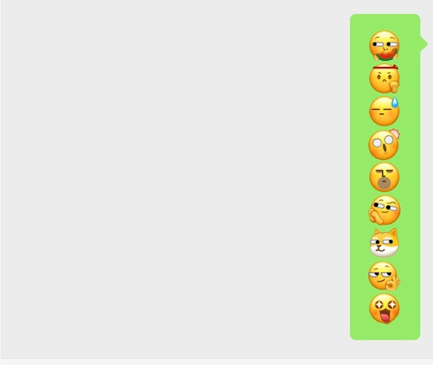 目前,微信这十款新默认表情正在进行灰度测试,所以部分微信用户可能无法正常显示。如果你没有看到更新,可以选择手动打出方括号+词语([吃瓜]、、、[天啊]、[Emm]、[社会社会]、[旺柴]、[好的]、[哇])在输入框中发送微信新表情,如果你感兴趣的话,不妨前往微信试一下。