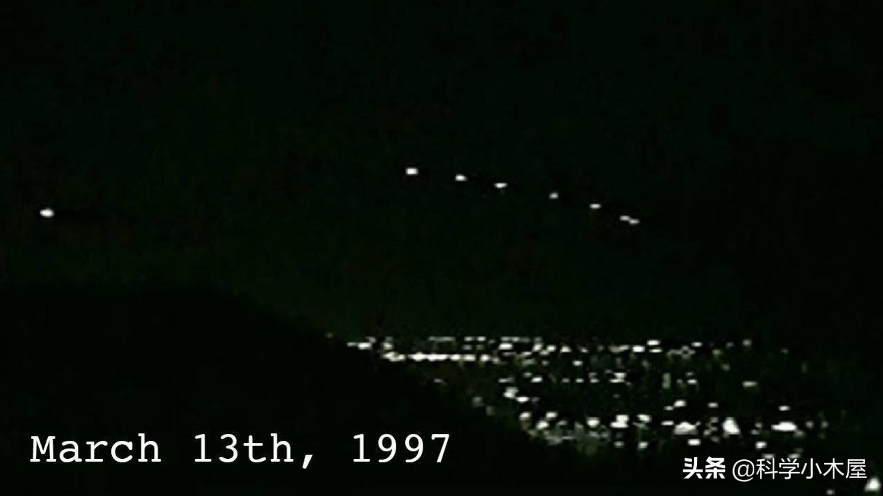 1997年3月13号晚上6点55分,在距离51区半小时车程的内华达州。亨德森市有人报告说看到五个不明的光点,以V字形的方式从西北方飞来。8点15分,美国国家ufo报告中心接到了第一个电话,电话那头一位退休的警员汤姆查韦斯声称,在亚利桑那州保罗登市看到5个橙色不明飞行物体低空无声的飞过。大约8点45分的时候,这些不明飞行物体终于抵达了凤凰城,并贝特里普罗特克拍下。他说当时他就感觉这些光点不像是飞机,因为他们几乎是原地悬浮在天空,所以他就赶快拍下了这段影片,然后没过多久这些原本几乎静止的ufo却又瞬间不见了。