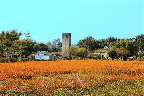 村子四周参天大树环抱,椰树、芒果树、小叶榕、翠竹等热带植物成片相连,水塘边的田野里种满了各色鲜花,春天到来,万花齐放,姹紫嫣红,美不胜收!