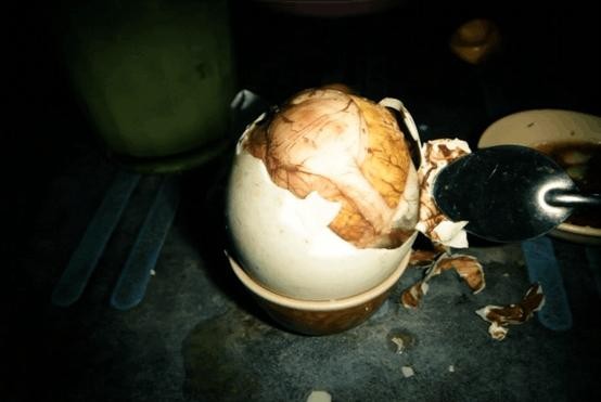这种毛鸭蛋其实是一只还未发育完全的胚胎。越南北方人喜欢吃长得老一些的毛鸭蛋,这时的鸭嘴和脚爪都已显雏形。通常这种食物都是煮熟了带壳吃,剥壳前要把里面的肉汤吸掉。蛋壳内即将孵化成功的鸭仔骨头都已成型,但吃起来还是软软的。