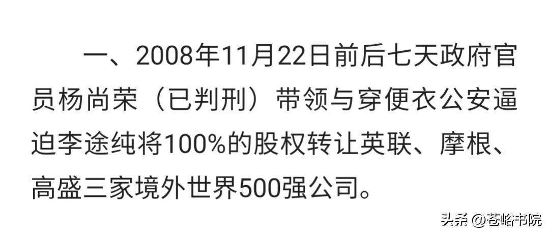 1、2008年11月22日,由株洲市官员出面联合便衣将李途纯全部股份转让给英联、高盛、摩根史丹利三个国际投行。