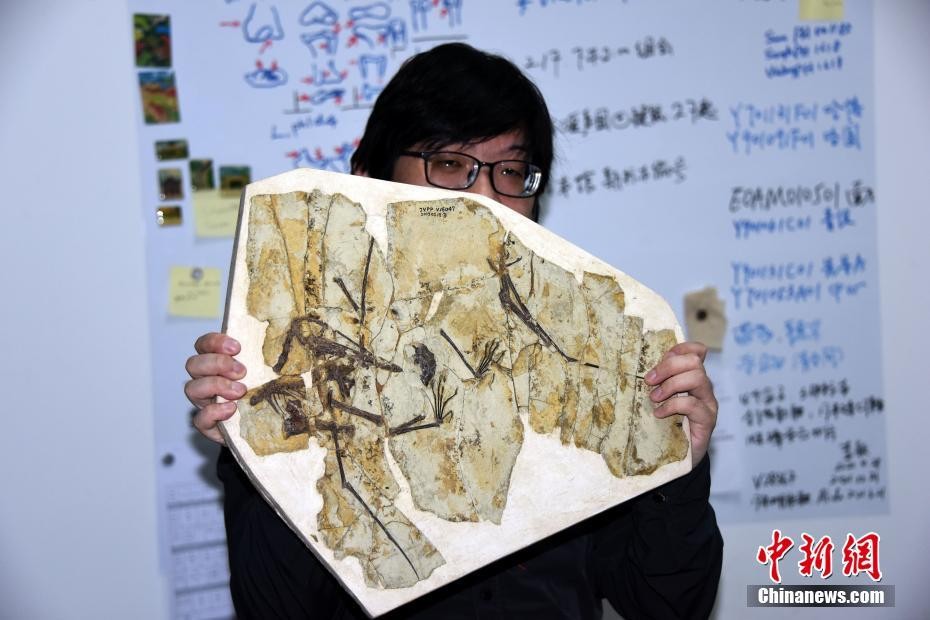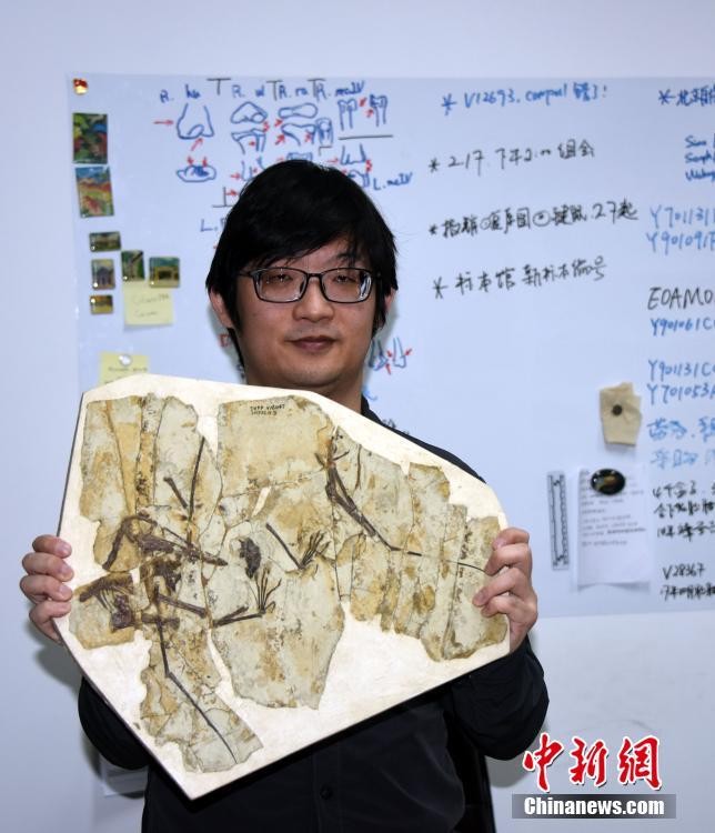 1.6亿年前的侏罗纪晚期,地球上的空中霸主——翼龙吃什么?食性有何特点?这一远古谜团被中国科学家最新首次发现并研究确认的翼龙食团化石所破解。中国科学院古脊椎动物与古人类研究所(中科院古脊椎所)汪筱林研究团队蒋顺兴副研究员等与临沂大学等合作,对采自辽西约1.6亿年前地层、被命名为“中国鲲鹏翼龙”的两件化石标本展开深入研究,首次研究发现并确认与中国鲲鹏翼龙化石共同保存的团状聚合体为翼龙进食后吐出的食团。依据食团中的食物残留,研究团队推测中国鲲鹏翼龙在不同年龄阶段,都主要以燕辽生物群中一种已灭绝的古鳕鱼类为食。这项翼龙研究重要成果论文,近日已在国际专业学术期刊《英国皇家学会自然科学会报 B辑》关于中国古生物的专辑上发表。图为2月16日,论文第一作者兼共同通讯作者蒋顺兴在北京的办公室展示介绍中国鲲鹏翼龙化石标本。 中新社记者 孙自法 摄