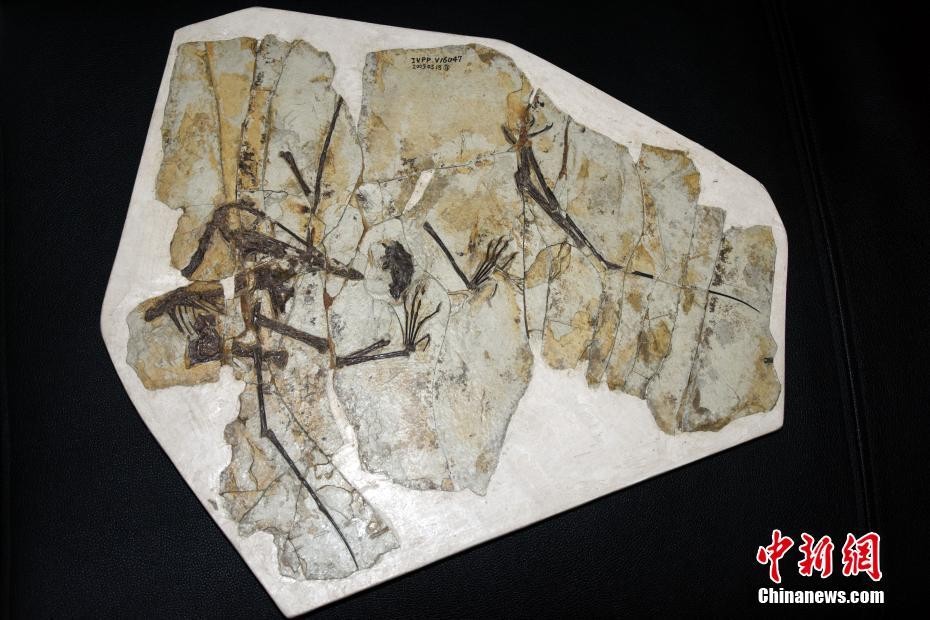 1.6亿年前的侏罗纪晚期,地球上的空中霸主——翼龙吃什么?食性有何特点?这一远古谜团被中国科学家最新首次发现并研究确认的翼龙食团化石所破解。中国科学院古脊椎动物与古人类研究所(中科院古脊椎所)汪筱林研究团队蒋顺兴副研究员等与临沂大学等合作,对采自辽西约1.6亿年前地层、被命名为“中国鲲鹏翼龙”的两件化石标本展开深入研究,首次研究发现并确认与中国鲲鹏翼龙化石共同保存的团状聚合体为翼龙进食后吐出的食团。依据食团中的食物残留,研究团队推测中国鲲鹏翼龙在不同年龄阶段,都主要以燕辽生物群中一种已灭绝的古鳕鱼类为食。这项翼龙研究重要成果论文,近日已在国际专业学术期刊《英国皇家学会自然科学会报 B辑》关于中国古生物的专辑上发表。图为2月16日,在北京拍摄的中国鲲鹏翼龙化石标本。 中新社记者 孙自法 摄