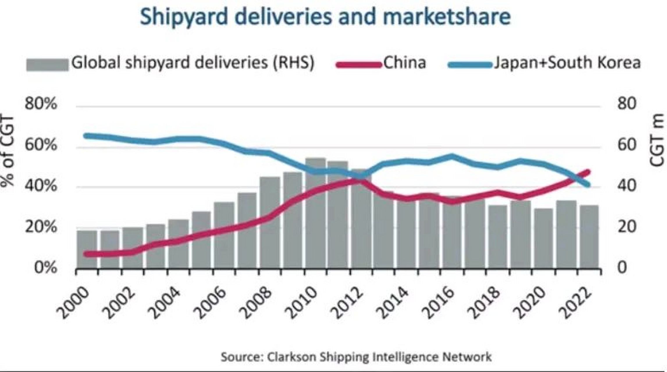 第四,造船业,韩国之前也是造船之王,造船一度是打遍世界无敌手,但2022年开始,我们就正式超越韩国,成为了世界第一的造船大国。