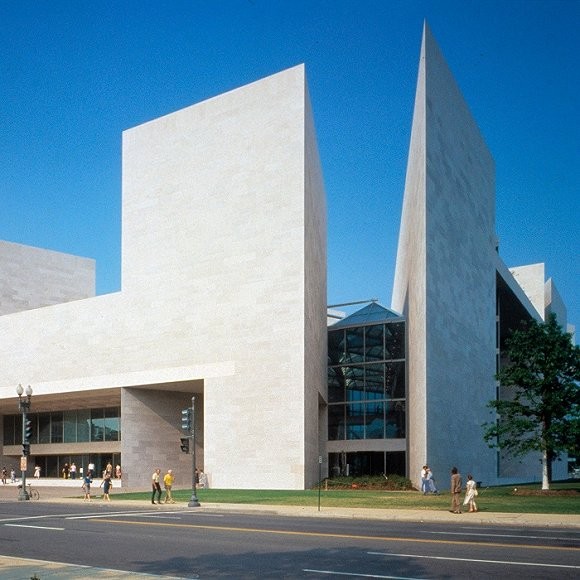 这个美国国家艺术馆的扩建部分位于艺术馆具有新古典主义风格的原始建筑的旁边。不过,二者的外形存在明显的区别。东馆的规划包括一个较大的等腰三角形和一个较小的直角三角形,以及三角形和菱形的内部空间。