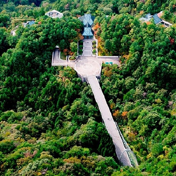 这个位于京都外部群山之中的美术馆即将在今年晚些时候举办路易威登时装秀。要想抵达这座美术馆,你需要穿过一条管状隧道和一座吊桥,并且爬上位于斜面地基上的台阶。