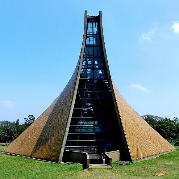 每个侧面的砖墙沿曲面上升,相交于一条玻璃滑梯,这条滑梯从建筑物顶部一直向下延伸到圣坛后方。建筑内部的墙壁由十字交叉的网格覆盖,这些网格用混凝土而不是木头制造,以便更好地对抗潮湿的空气和地震。
