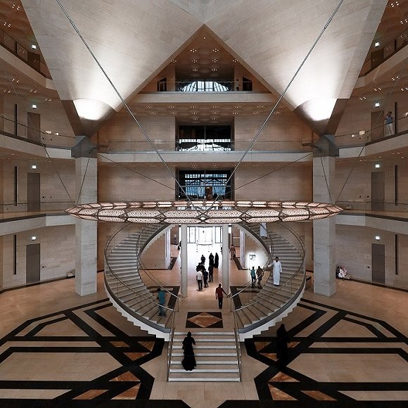 这座建筑位于阿拉伯湾中的一座人工岛上,采用了浅色石灰岩石块,可以柔和地反射沙漠中的太阳光。北面的玻璃幕墙使五层陈列空间中的人们可以看到阿拉伯湾和多哈西湾地区的全景。