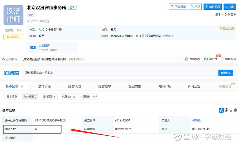4、企查查上显示2021年11月,律所人数为6人 。