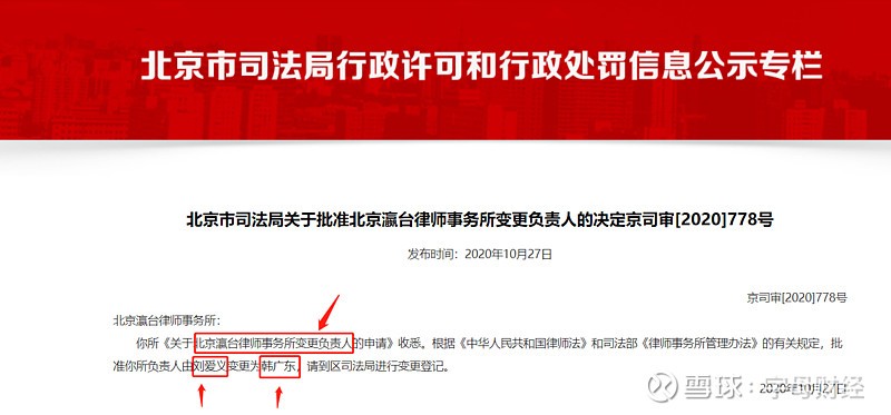 3、2020年10月27日,律师事务所的负责人由刘爱义变更为韩广东。