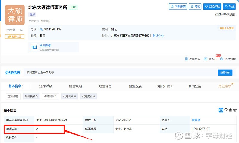 5、企查查上2021年11月显示 律所人数为2人。