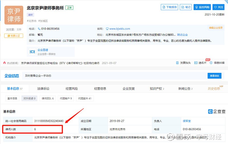 5、企查查显示,2021年11月 律所人数为6人 。