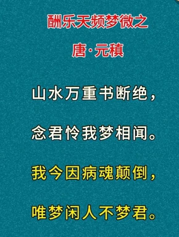 在《酬乐天频梦微之》中,元稹以深情的笔触,表达了自己因病而梦绕友人的深切情感。其中“我今因病魂颠倒”一句,尤为动人。这句诗写出了诗人因病痛折磨,心神不宁,梦中频繁与友人白居易(字乐天)相遇的情景。诗人以“魂颠倒”三字,形象地描绘了自己因病而精神恍惚的状态,同时也透露出对友人的深深思念。他虽身处病榻,但心中所念,唯有友人,这份深情厚谊,跨越时空,令人动容。