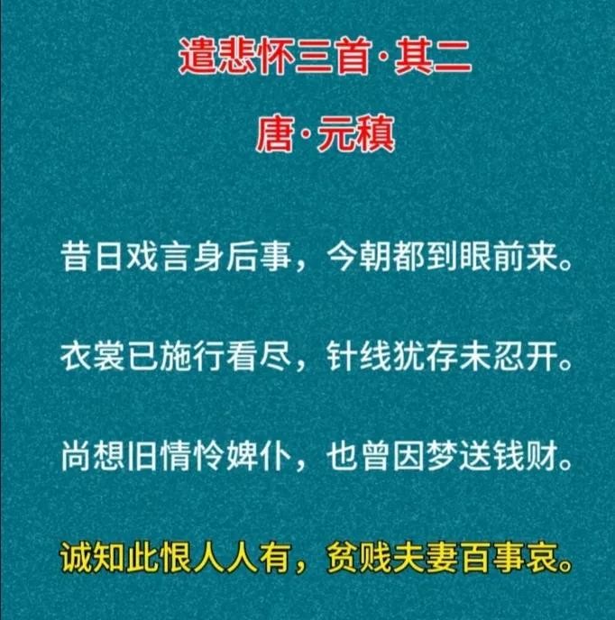 《遣悲怀三首•其二》中,元稹以自述的方式表达了自己对亡妻的深深怀念和悲痛之情。其中“诚知此恨人人有,贫贱夫妻百事哀”尤为感人。这两句诗写出了夫妻死别后的悲痛心情,特别是对于同贫贱共患难的夫妻来说,一旦永诀,更是悲哀至极。诗人用平淡而真挚的语言,展现了他们贫贱夫妻的相濡以沫和相思相念,打动了无数读者的心弦。