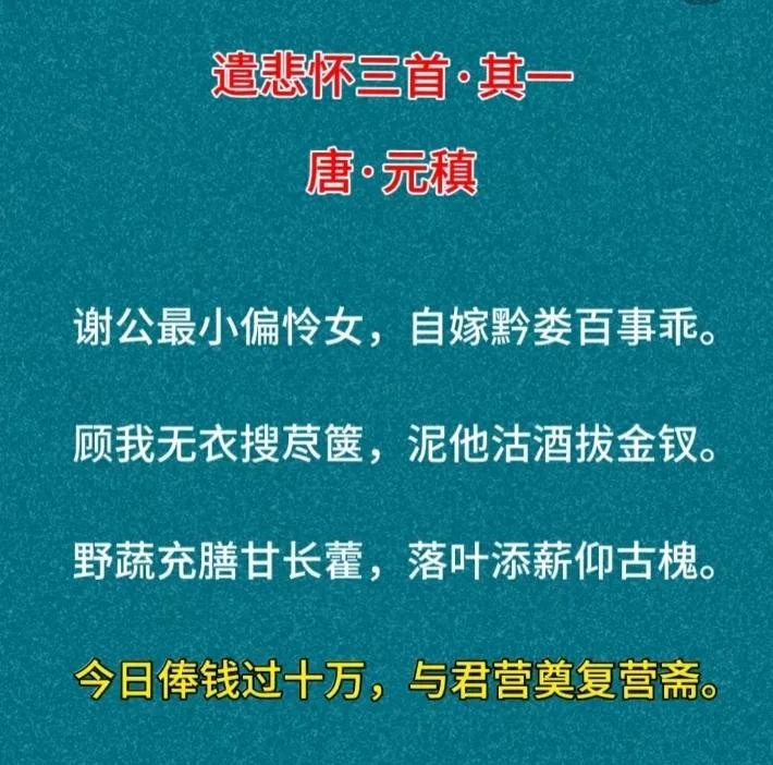 在《遣悲怀三首·其一》中,元稹以深情的笔触,回忆了自己与亡妻韦丛共度的生活片段,其中“今日俸钱过十万”,诗人以今日之俸钱与昔日之清贫形成鲜明对比。昔日,他与韦丛共度贫寒岁月,虽生活艰辛,但两人相濡以沫,情感深厚。而今,他俸钱过万,生活条件大为改善,然而韦丛却已不在人世,无法共享这份荣华。这种强烈的反差,使诗人内心充满了愧疚与遗憾。他深知,再多的钱财也无法弥补失去爱妻的痛苦,这份悔恨与无奈,在诗句中得到了淋漓尽致的展现。