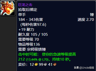 巨龙之击这把经典的红色龙头单手锤我想应该也是很多玩家的经典记忆了吧,虽然属性上来说只是加了耐力而已比较一般,但是2.7的攻速搭配97.6的秒伤来说前期绝对不弱,关键是当它击中敌人之后可能使我们的急速等级提高212点持续10秒,恐怖如斯四个大字都无法表达出它的优秀了吧,而且这把单手锤的打击手感真的是特别的棒棒哒,用过的玩家都说好,而且是大家都那么说的,所以必定是非常不错的武器了,你值得拥有,推荐指数满天星辰直戳天花板,我戳我戳我戳戳戳!