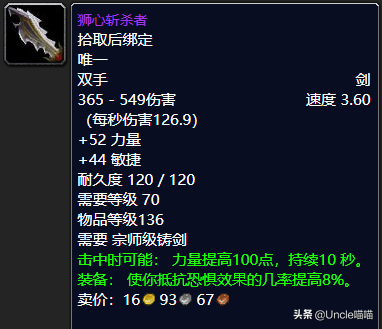 这把武器的话我想如果你当年曾经有幸接触过锻造这个专业而又恰巧是可以拿双手剑输出的职业的话,那么我想你一定不会忘记这把传奇双手剑狮心斩杀者,经典的狂野之狮造型已然夺人眼球,而高端敏捷超强力量着实不凡,3.6的攻速搭配上126.9的秒伤来说也是非常的可观的,至于装备效果击中时可以提高100点的力量持续10秒堪称恐怖如斯了,而且最为重要的是你装备之后抵抗恐惧的效果机率提高8,敌方的术士看到你这样的玩家直接大喊一声就倒下了,因为他根本恐惧不到专业的你啊,经典武器狮心斩杀者你值得拥有,推荐指数满天星辰直戳天花板,我戳我戳我戳戳戳!