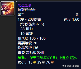 沐浴在光芒之中重生吧,感受这光芒的耀眼力量吧,这把单手剑光芒之怒的话其实还是相当的可以的,特别是对于攻速以及秒伤来说特别的棒棒哒,虽然来说敏捷对于战士不太友好,但是对于盗贼还是可以的嘛,至于18点的命中等级提高来说也是相当的可以,经典单手剑光芒之怒你值得拥有,推荐指数满天星辰直戳天花板,我戳我戳我戳戳戳!