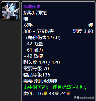 风暴使者我想这把三段锤应该没有任何人会忘记的吧,属性方面的话42点力量、61点耐力、42点敏捷加持可谓是非常的优秀了,这些其实都不重要,3.8的攻速搭配127的秒伤真心的给力啊,而且击中之后会让我们的敌人昏迷4秒,而当他反应过来的时候他已然和我们的天使姐姐谈心去了,堪称经典武器你值得拥有,推荐指数满天星辰直戳天花板,我戳我戳我戳戳戳!