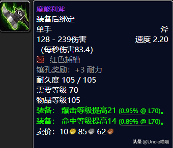 据说这把利斧可以用了外域特有的魔能机甲核心充能打造而成的,所以就叫它为魔能利斧。这把单手斧的话就前期而言还是可以值得拥有的,高秒伤带红色插槽高命中高爆击等级都是非常的NICE值得推荐,推荐指数满天星辰。