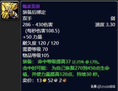 这把东西的话图纸掉率真的很低,据说当年的话刷太阳之井高地的小怪掉率还是可以的,当然它因为是装绑的所以还是会有好多“氪金”的玩家去AH消费一把,带在身上可谓是金碧辉煌引人侧目堪称经典,而且就圣剑二字的话我想玩dota类游戏的你也应该不会陌生吧,圣剑一出谁与争锋?经典氪金圣剑高端玩家必备神器你值得拥有,推荐指数满天星辰直戳天花板,我戳我戳我戳戳戳!