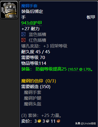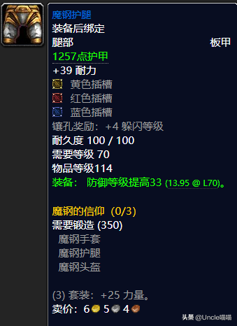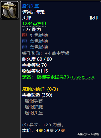 如果你是一名专业的T,而且是从小号起来的话那么我想你一定会去AH买一套专业前期MT必备的魔钢套装,套装耐力加持堪称恐怖如斯,而且每个部位都是带了非常可观的插槽可谓NICE,而且就防御等级提高而言的话已然前期天花板堪称经典了,套装加持25点的力量的话也让你有足够的力量打的怪物嗷嗷嗷直叫,仇恨值瞬间拉满,堪称经典,前期必备MT套装,推荐指数满天星辰直戳天花板,我戳我戳我戳戳戳!