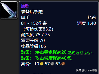 这一把匕首的名字叫挽歌可谓是非常的古典风格了,堪称经典,虽然造型上比较简单地扭曲了几下而已,但是就匕首本身的攻速秒伤以及爆击等级提高和攻击强度的话来说都是前期很厉害的东西了,而且关键是装备绑定的所以AH入手一把的话对于土豪盗贼玩家来说还是相当的棒棒哒的,推荐指数满天星辰直戳天花板,我戳我戳我戳戳戳!