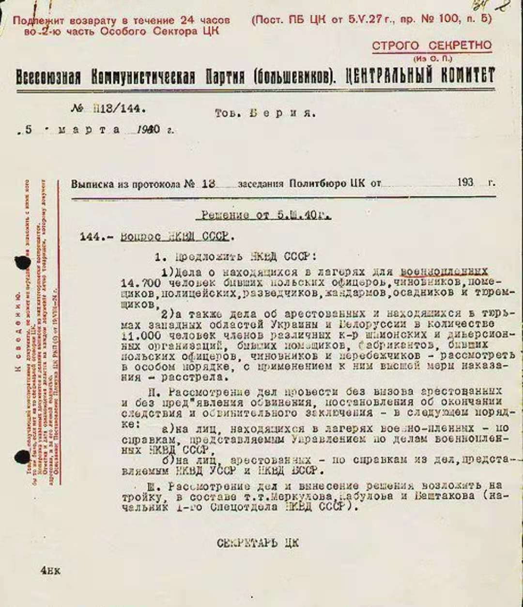 1940年3月5日贝利亚给斯大林写了一份报告,详细汇报了波军被俘军官的人数、军阶、职业和政治立场,指控他们是“间谍、宪兵、破坏分子、地主、资本家、牧师及反动官员”,称他们是苏维埃“不共戴天的敌人”,因此建议按“特别程序”将他们全部处决。当天,联共(布)政治局就做出决议,同意贝利亚的建议,命令内务人民委员会对报告中所列25700人执行枪决。