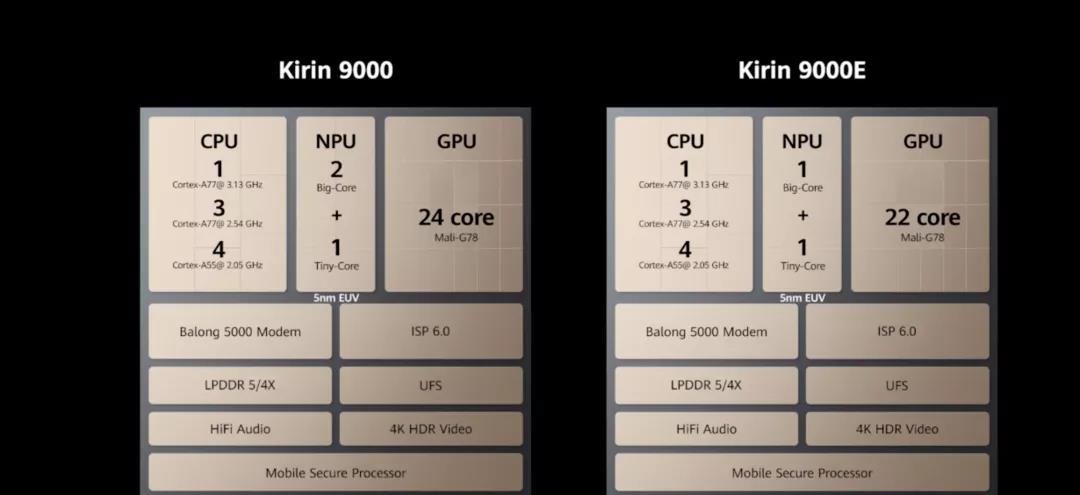 麒麟9000E相比麒麟9000,主要是少了2个GPU核心,NPU部分减少了1个大核,其他方面都是一样的,均集成了5G基带。