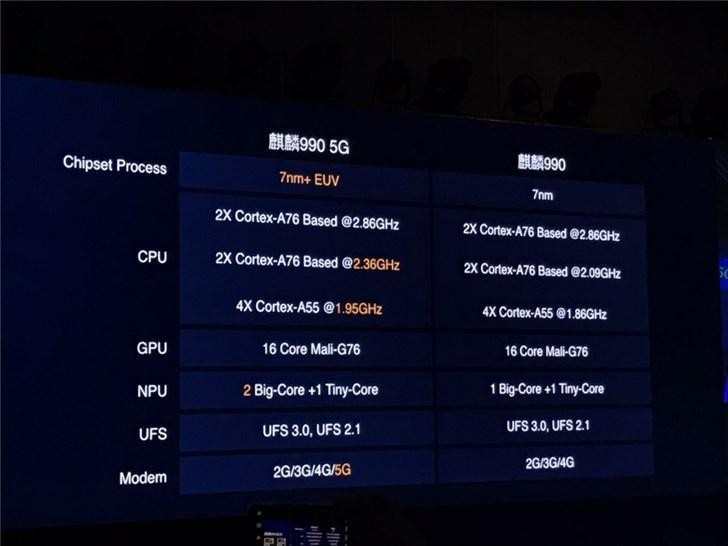 麒麟990相比麒麟990 5G在CPU频率上面进行了调整,NPU核心也减少了1个大核心,而且没有集成5G基带,只集成到4G基带,其他方面基本一致。