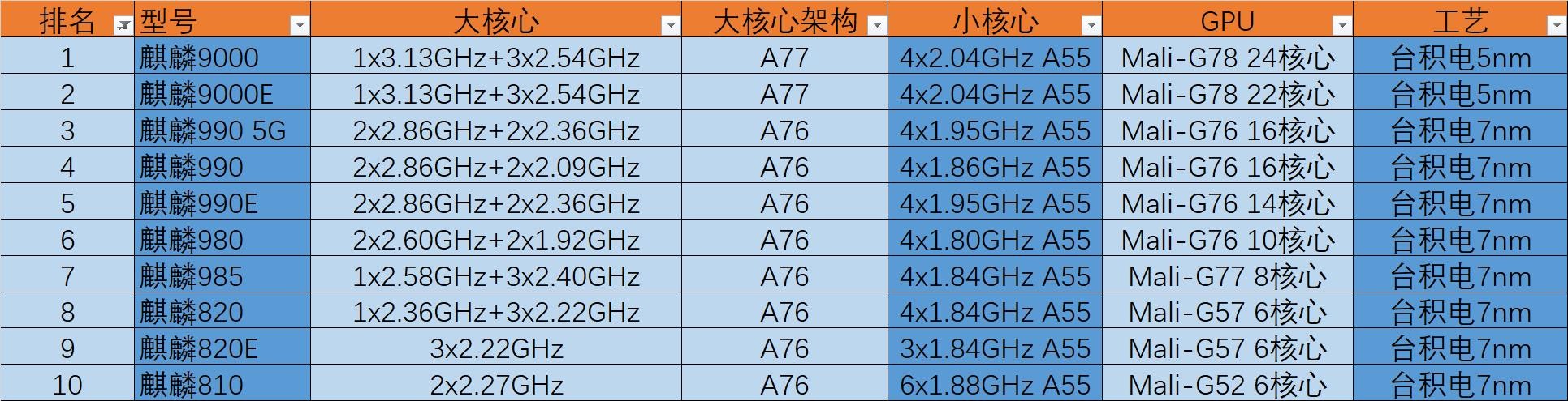 麒麟芯片比较多,本文只对近几年的中高端麒麟芯片进行一个排序,下图就是排名情况,相关芯片的具体情况将根据排列顺序依次进行简单的介绍