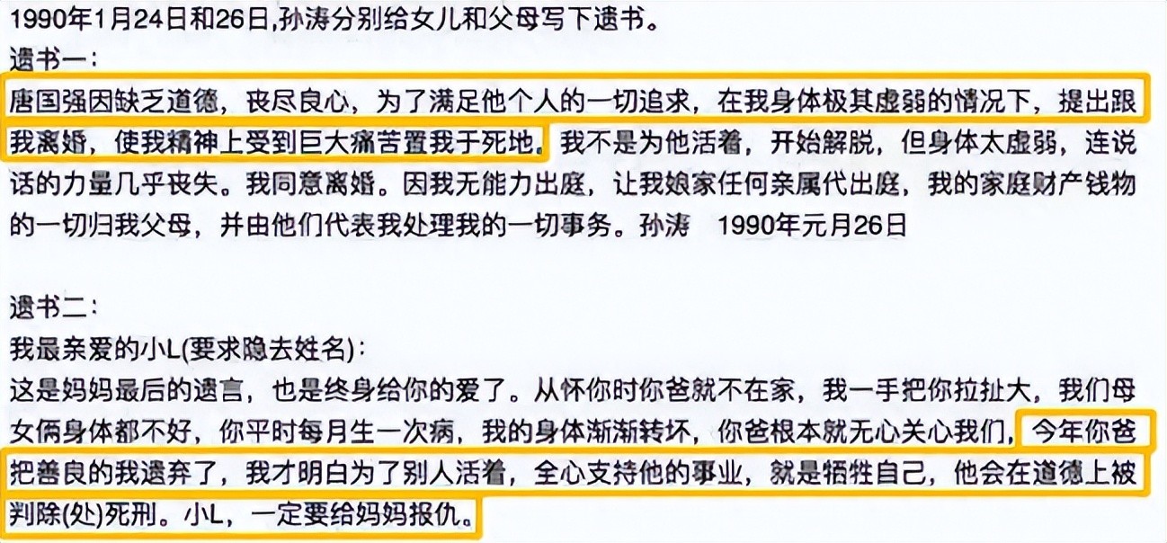 她给父母和女儿唐莉留下了三封遗书,控诉唐国强的不忠,要求女儿为自己报仇。