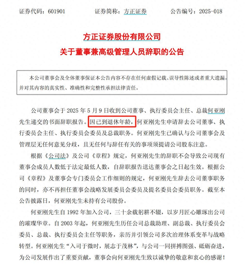 方正证券表示,因已到退休年龄,何亚刚申请辞去公司董事、执行委员会主任、执行委员会委员及总裁职务。何亚刚已确认与公司董事会及管理层无任何意见分歧,且无任何与辞任有关的事项须提请公司股东注意。