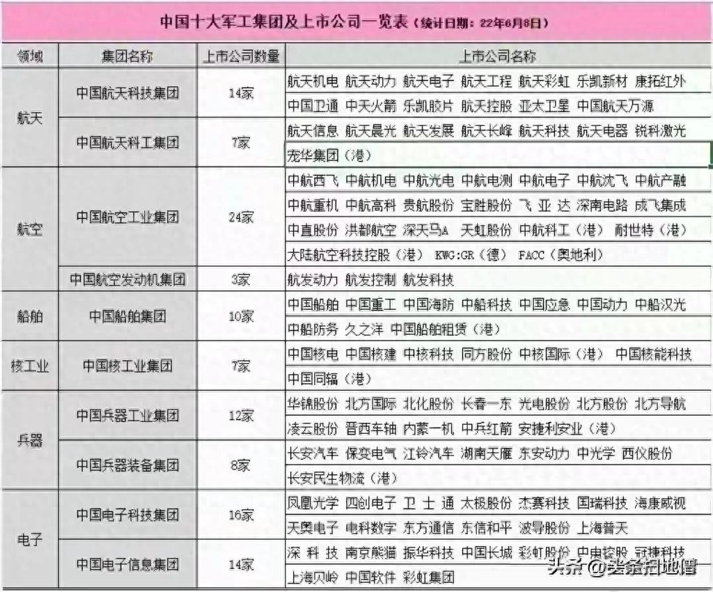 这些军工集团不仅实力雄厚,而且通过资本市场实现了资源的优化配置和产业的快速发展。以下是各集团旗下的主要上市公司:
