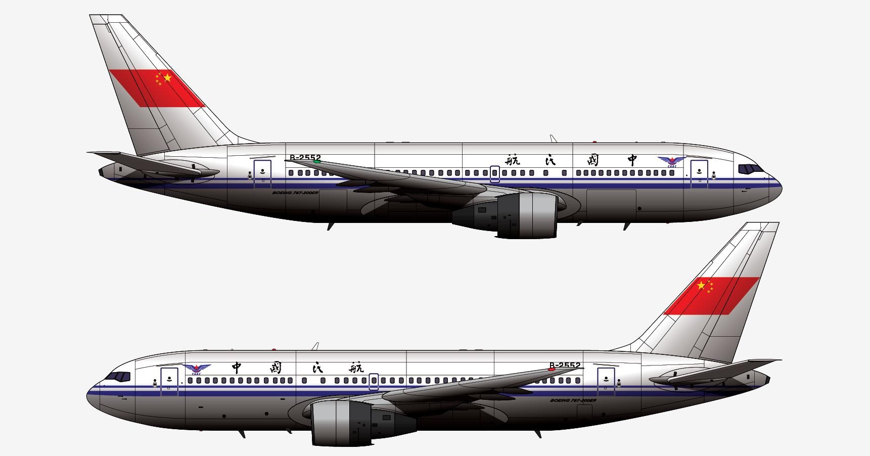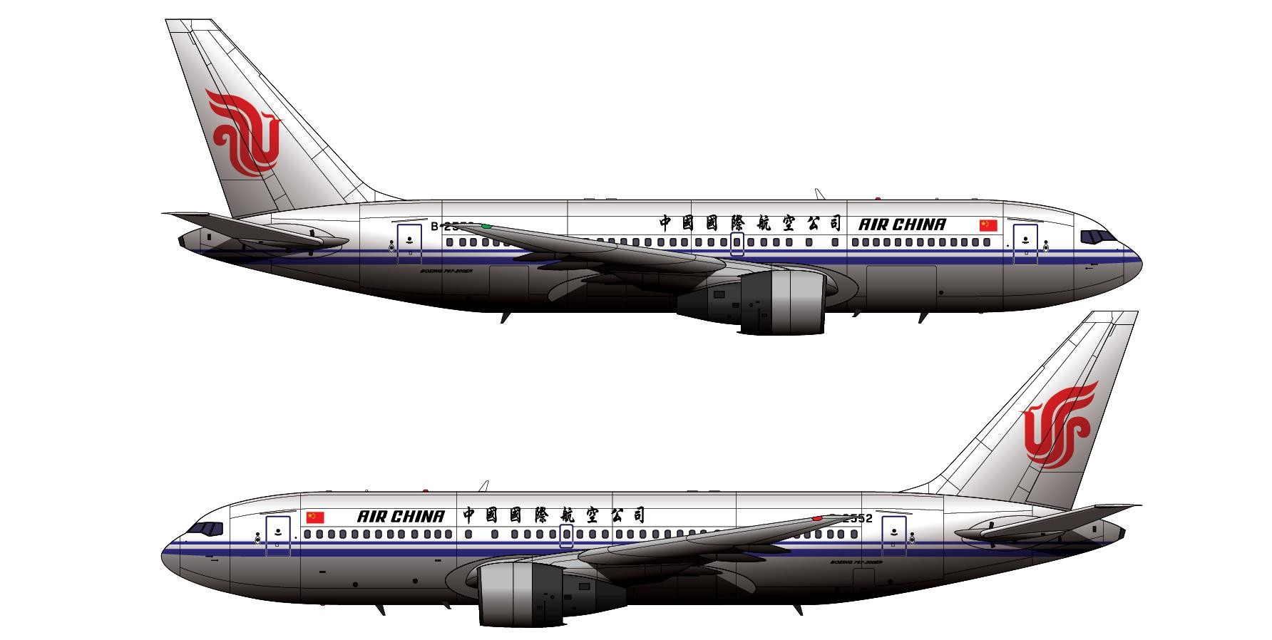 本厂长绘制中国国际航空公司涂装的B2552号波音767-200ER型客机二视图