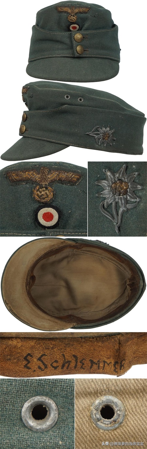 将官M43野战帽,帽冠上有金线滚边,鹰徽也是金线刺绣而成,纽扣为金色。帽内前还有皮质防汗带,做工很精良。