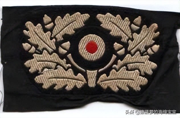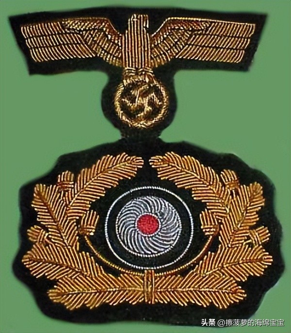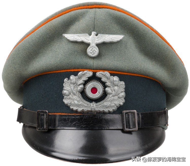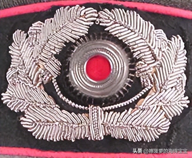 上面的橡叶簇和帽徽都是用金属线刺绣而成;下面的橡叶簇使用金属线,帽徽是大檐帽标准金属帽徽。
