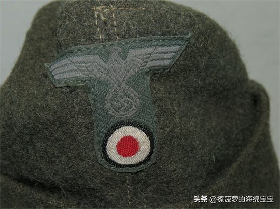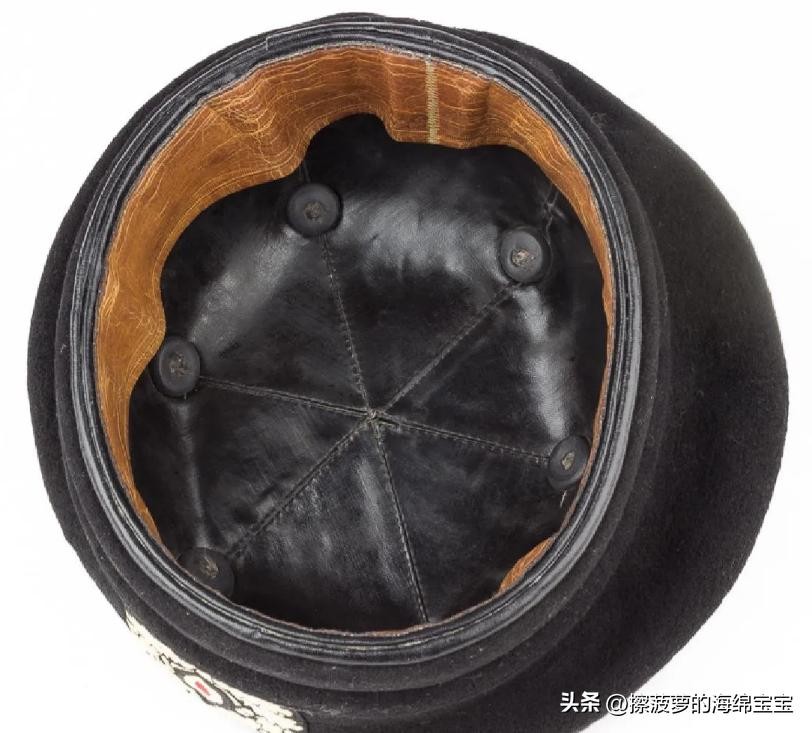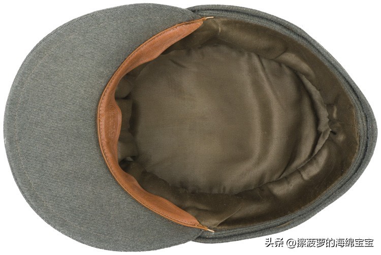 这款军官大檐帽的帽徽和鹰徽都是布质刺绣,用的华达呢制成,帽顶边缘和帽墙上下还有白色滚边色,代表步兵。