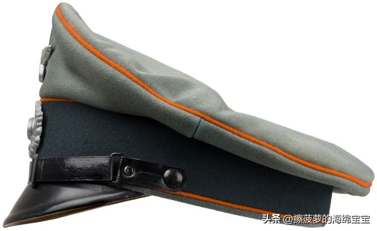 这款军官大檐帽的帽徽和鹰徽都是银色金属徽章,用的羊毛料制成,帽顶边缘和帽墙上下还有金黄色滚边色,代表骑兵。