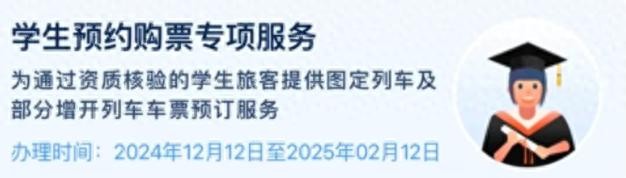 2024年12月12日起至2025年2月12日,符合条件的学生旅客,可在铁路12306手机客户端“学生预约购票专项服务”专区,预约购买2024年12月28日至2025年2月28日的火车票。