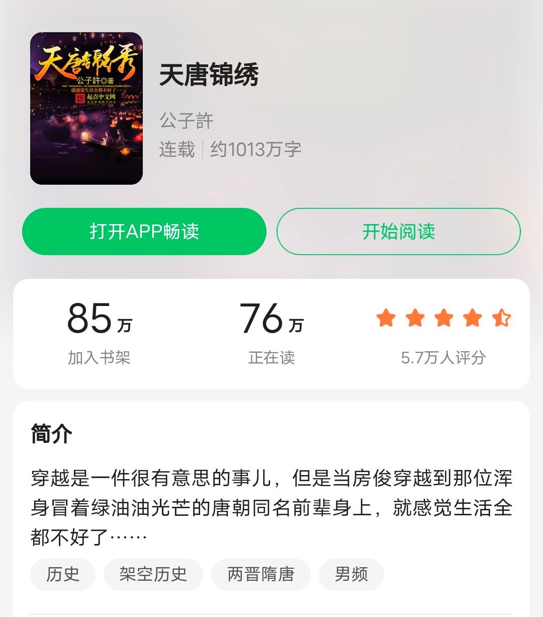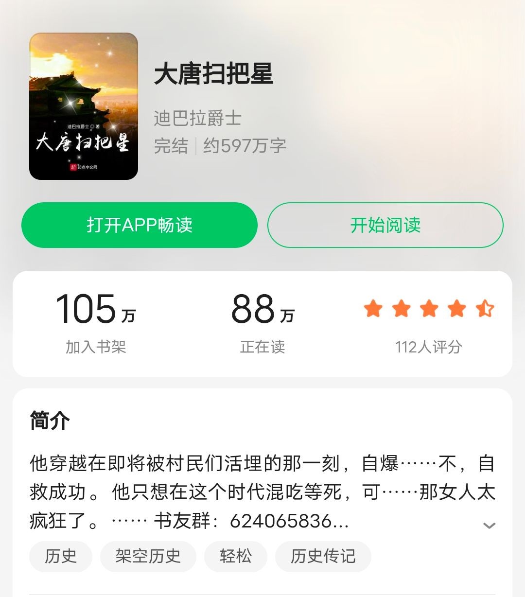 历史文大神迪巴拉爵士的最新作品,主角穿回大唐盛世,因为“扫把星”的名头差点被村民活埋,为了摆脱身上的霉运光环主角开始了自救之旅,通过美食发家致富,再通过“改造”奸臣许敬宗帮他解决了几场难题,进入了皇帝的视线,终于一步步打开局面,没有超常的金手指,文风诙谐幽默,男主智商很高,作者历史知识扎实,朝堂政治的矛盾也写得清晰明了,各种配角也活灵活现,综合下来属于一本上等粮草。