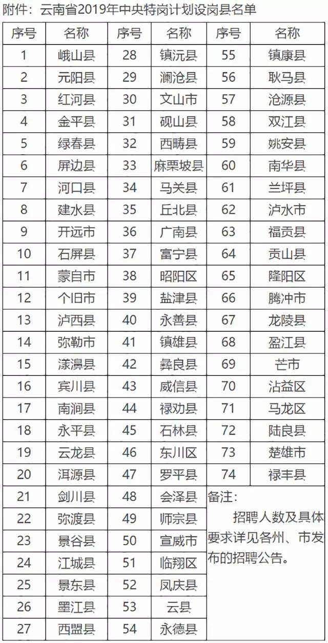 掌上春城讯日前,省教育厅网站发布了《云南省教育厅关于2019年中央特岗计划教师招聘考试的公告》,公布了云南省2019年中央特岗计划设岗各县人数,以及招考的时间安排。