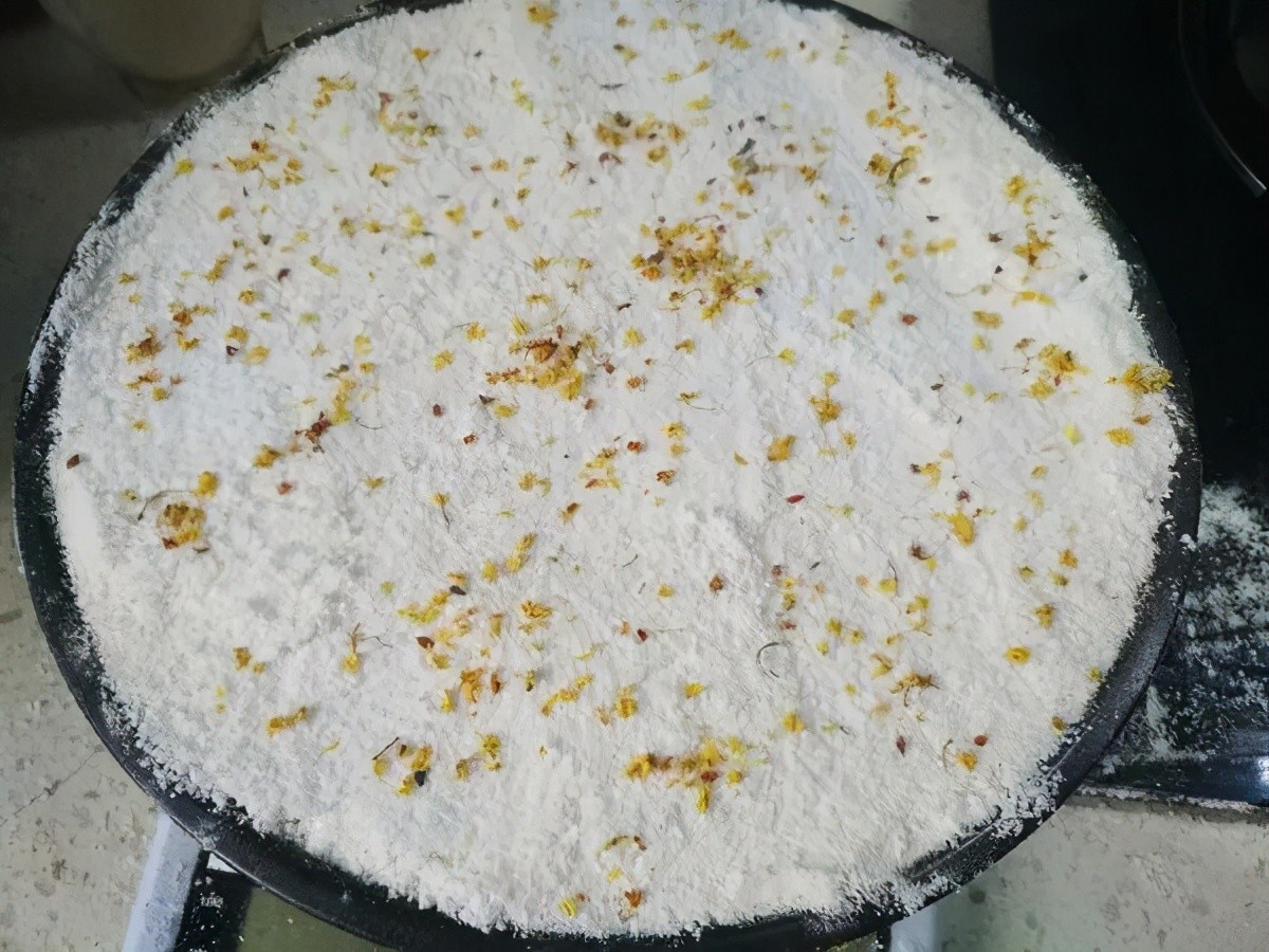 1. 先准备糖粉馅料:将干桂花搅碎,和糖粉混合均匀,备用。