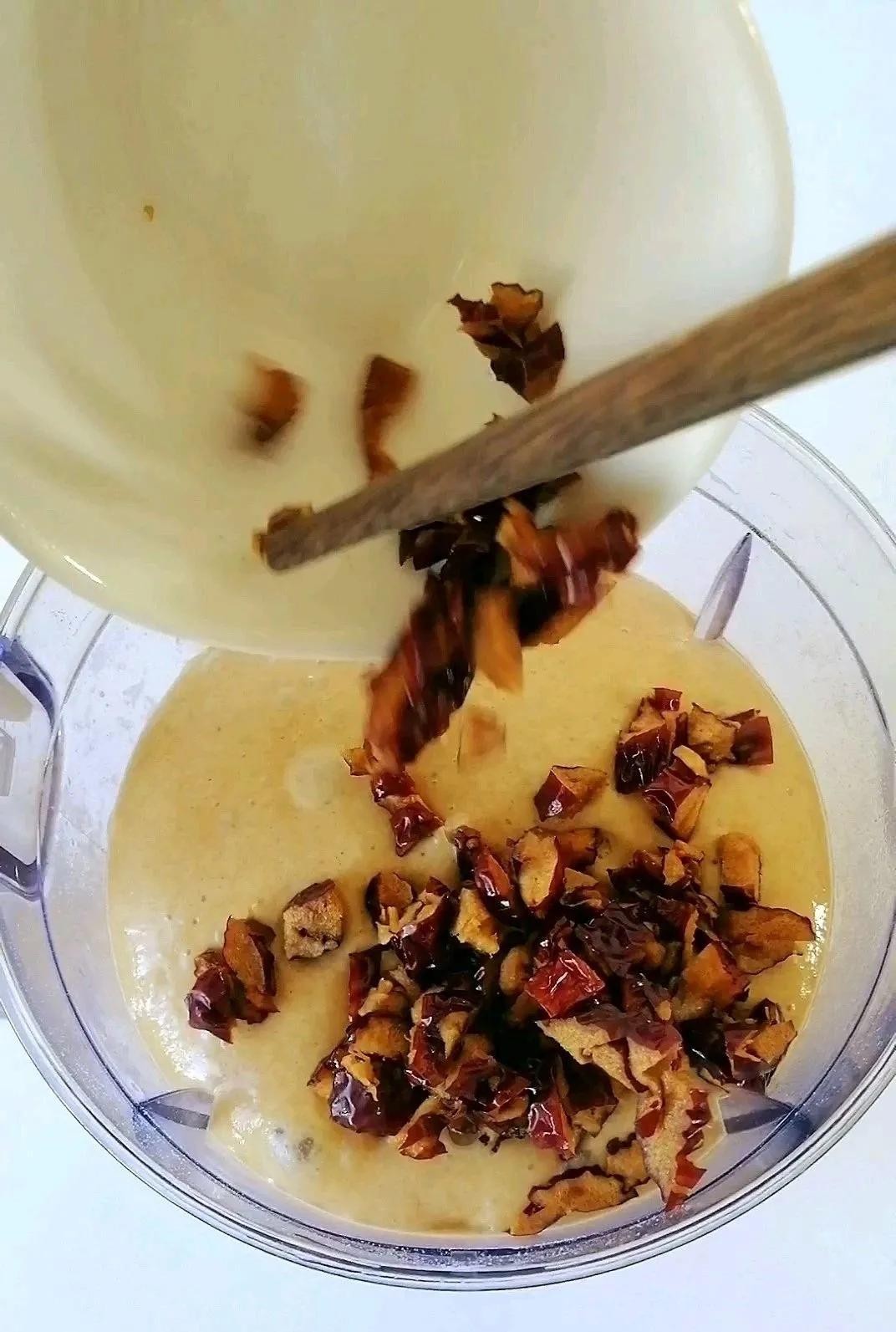 3. 红枣切下枣肉,加入发酵好的面糊中拌匀。