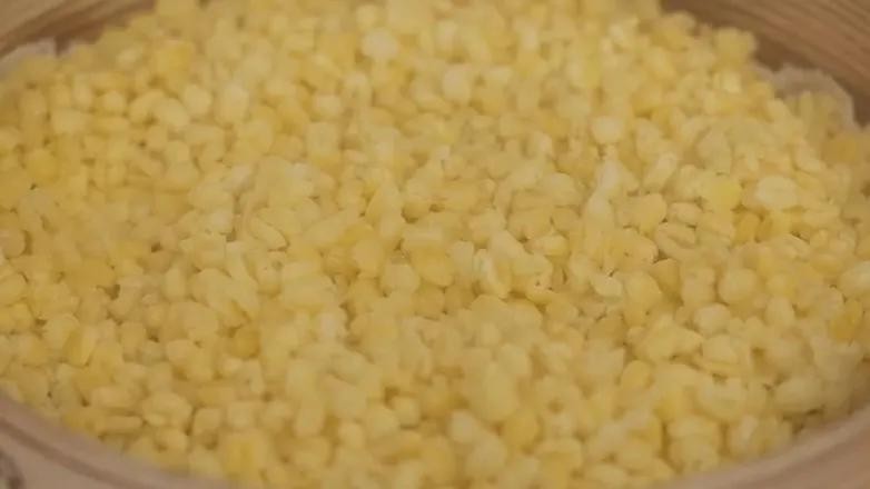 2. 绿豆沥干水,放入蒸笼铺开,大火蒸到绿豆开花,且容易捏碎的状态,蒸熟为止。