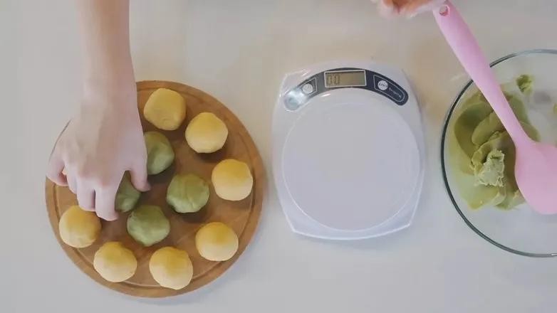 7. 把两种口味的绿豆团,分别分成每个40g。