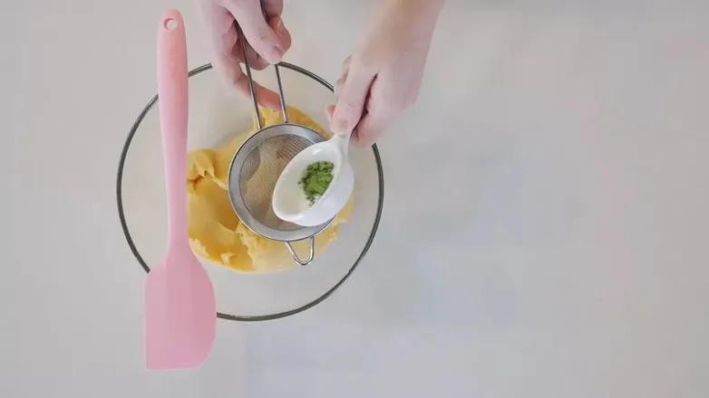 6. 把绿豆团分成两份,其中一份趁热筛入抹茶粉拌匀,调成抹茶口味。