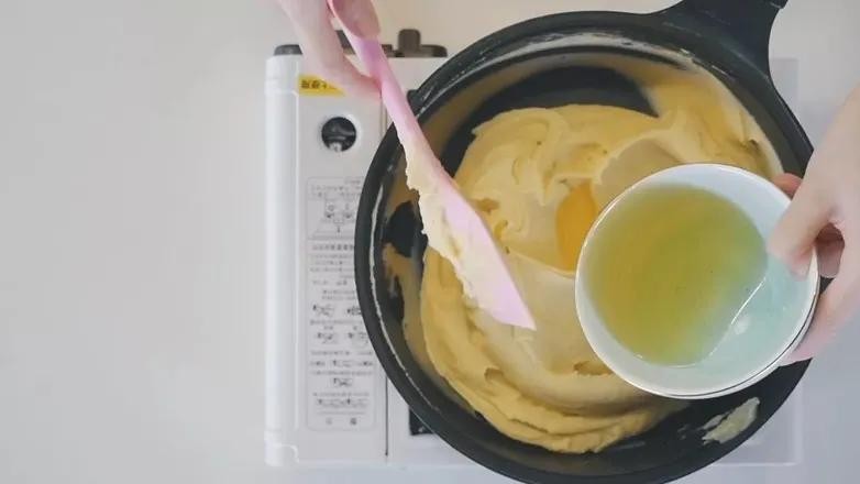 4. 锅中放入绿豆泥,分次加入玉米油和细砂糖,开小火开始翻炒。